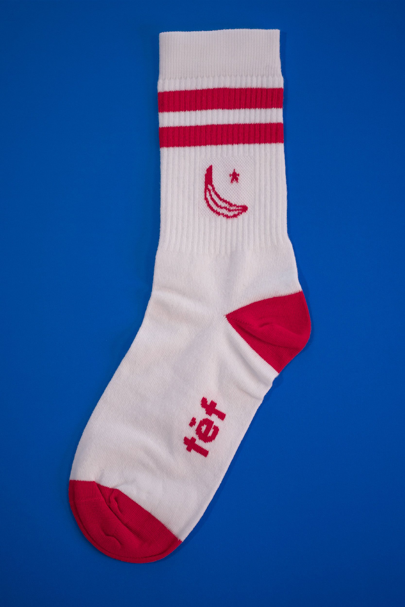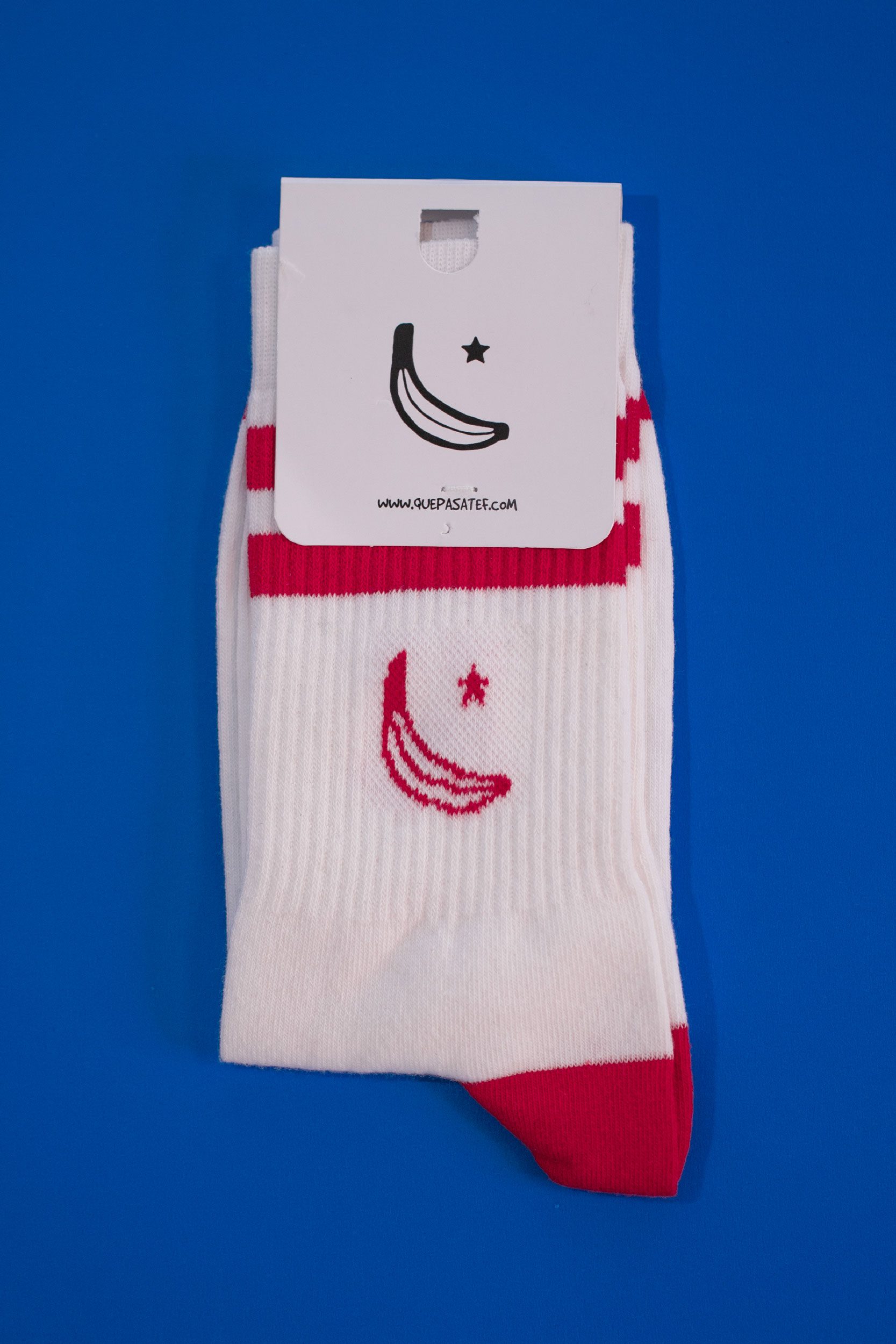¡Calcetines tef! Calcetines urbanos de estilo deportivo, blancos con dos franjas rojas, con el isotipo del plátano en rojo.
