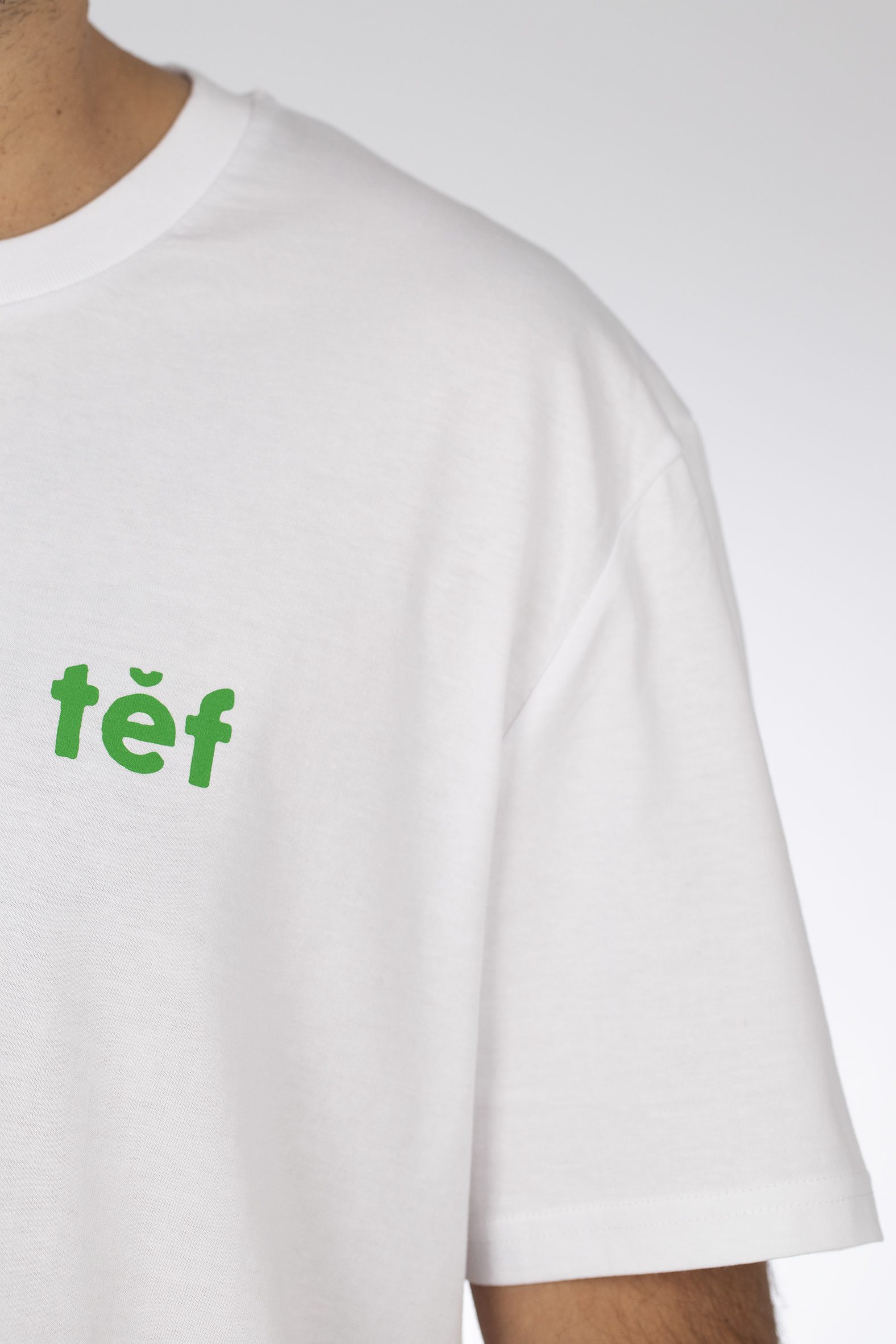 Jairo ha escogido una camiseta blanca con un estampación en verde con su cara en la parte trasera y en el pecho el logo de tef.