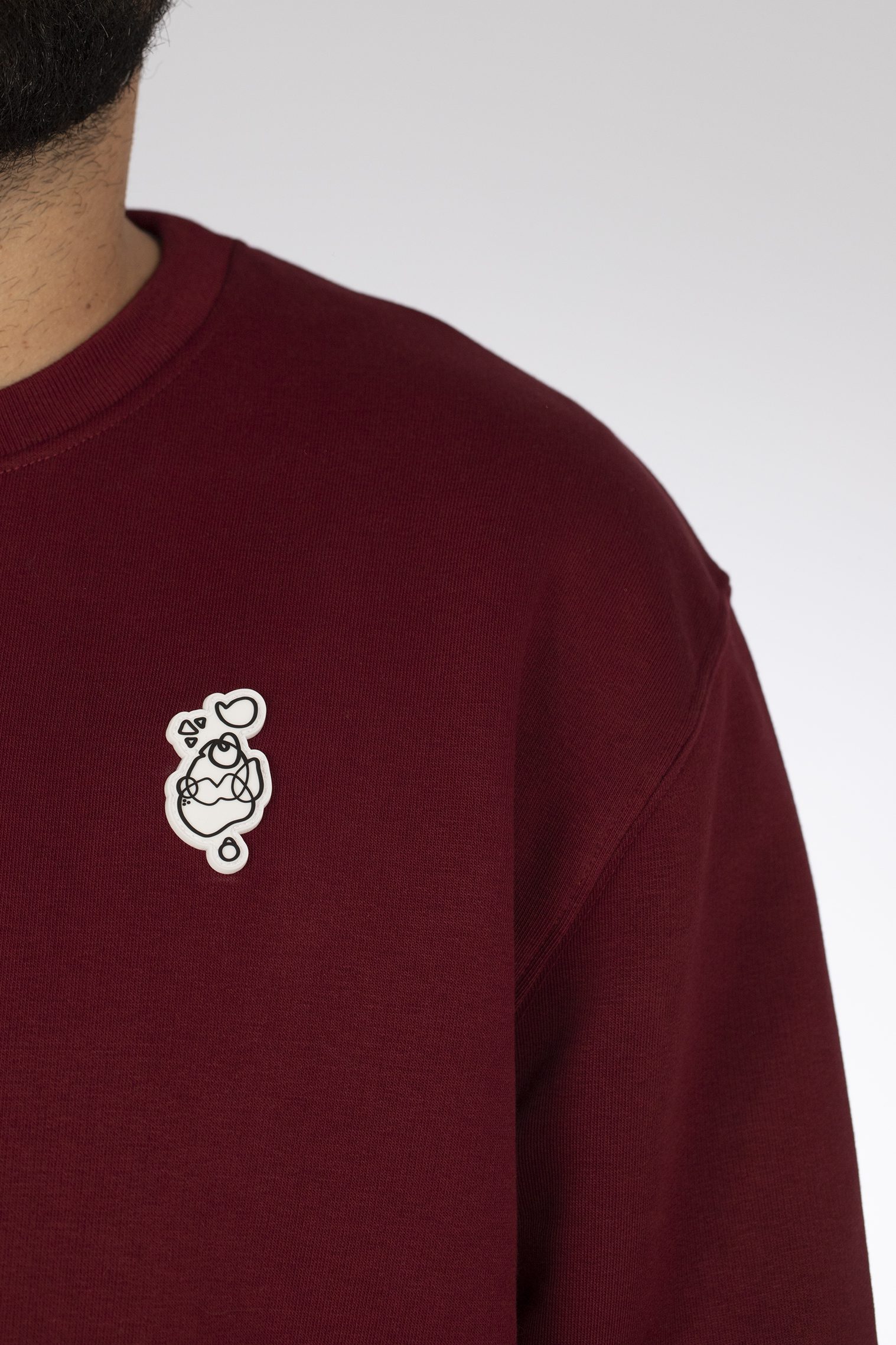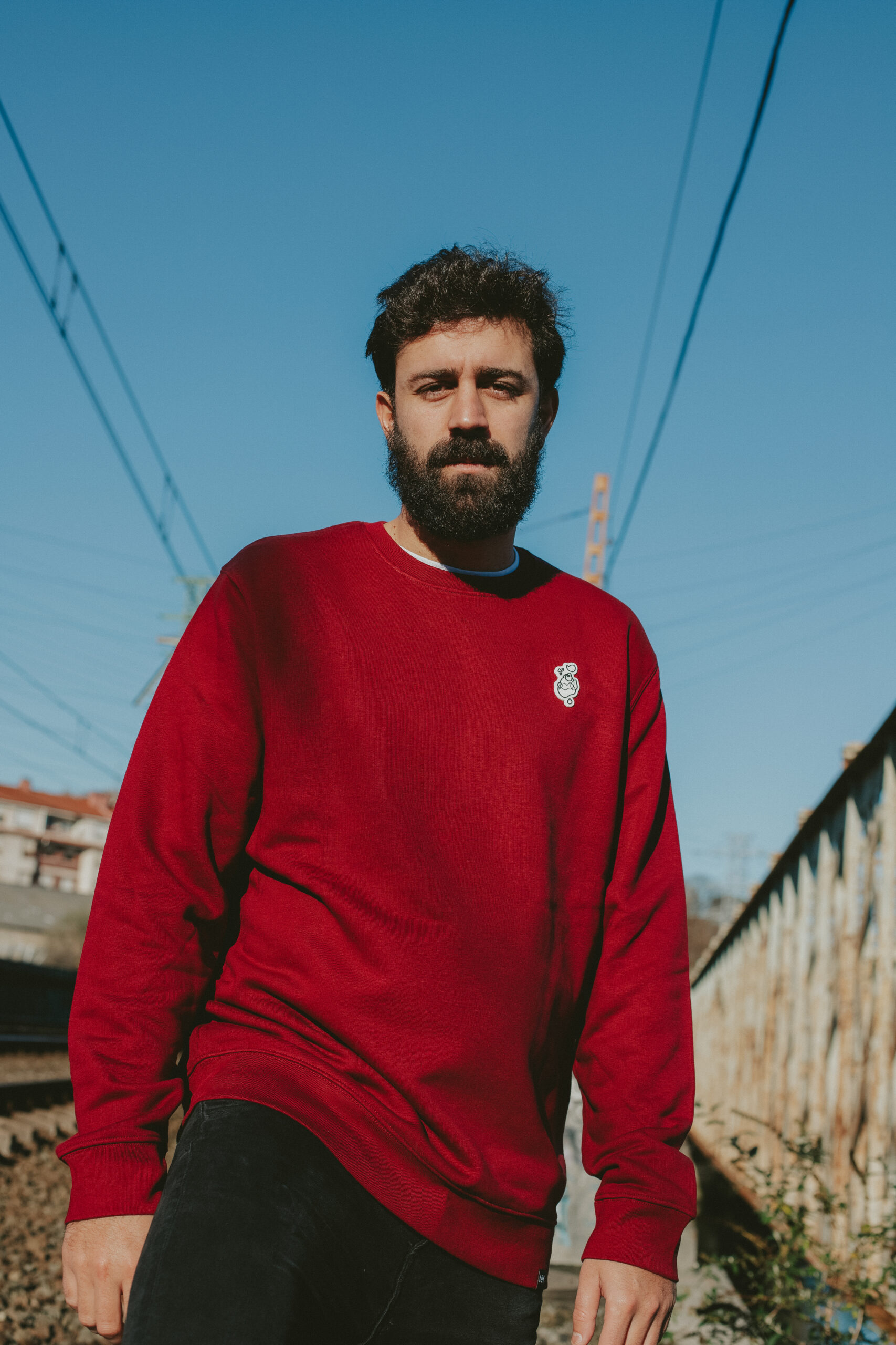 Sudadera burdeos de 350gr. elaborada con algodón orgánico hilado y peinado (85%) y poliéster reciclado (15%).