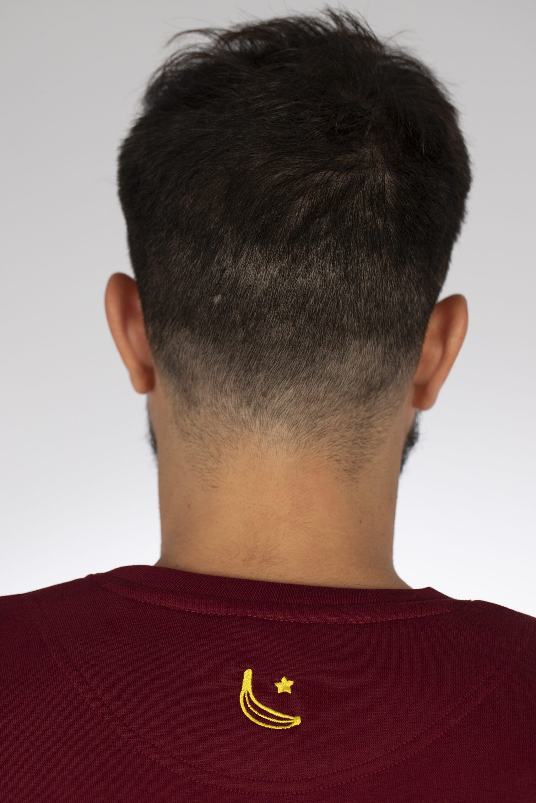 Jairo se ha pillado una sudadera burdeos con un parche de PVC con su cara en el pecho y el logotipo del plátano bordado en amarillo en la parte trasera.