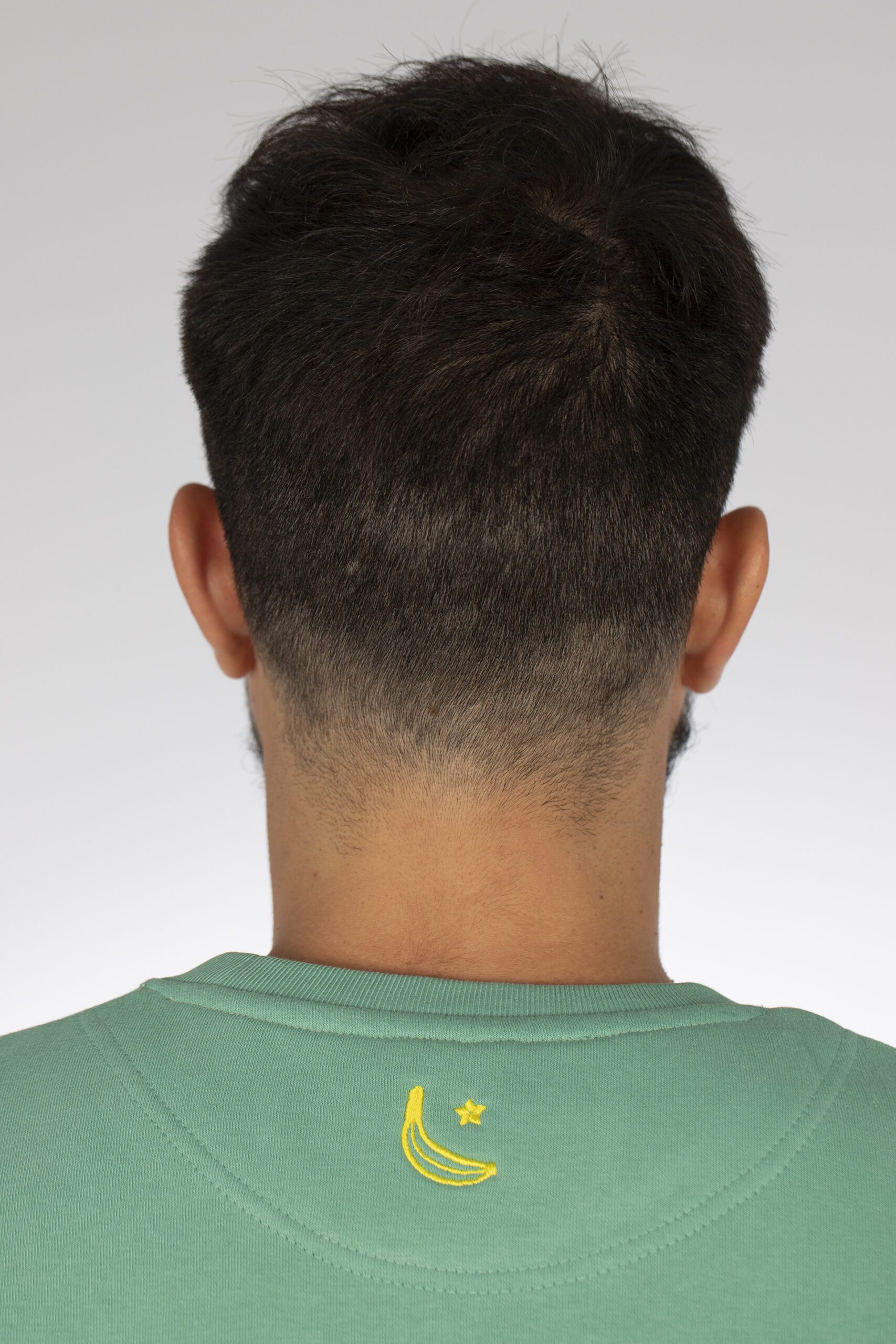 Martxelo ha elegido una sudadera verde con un parche de PVC con su cara en el pecho y el logotipo del plátano bordado en amarillo en la parte trasera.