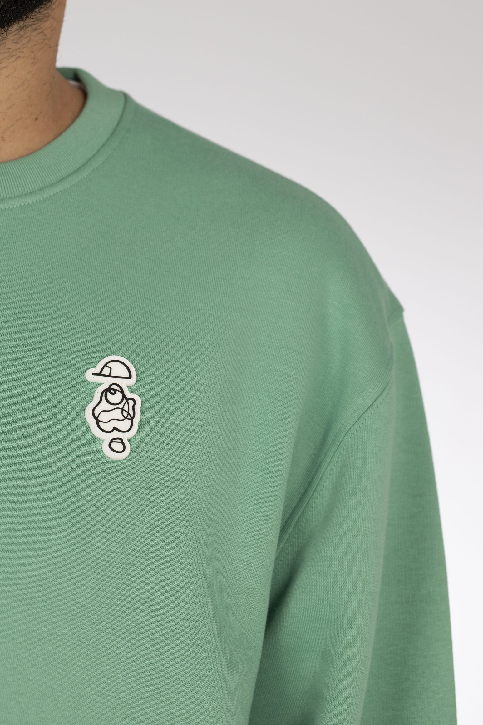 Sudadera verde pastel de 350gr. elaborada con algodón orgánico hilado y peinado (85%) y poliéster reciclado (15%).