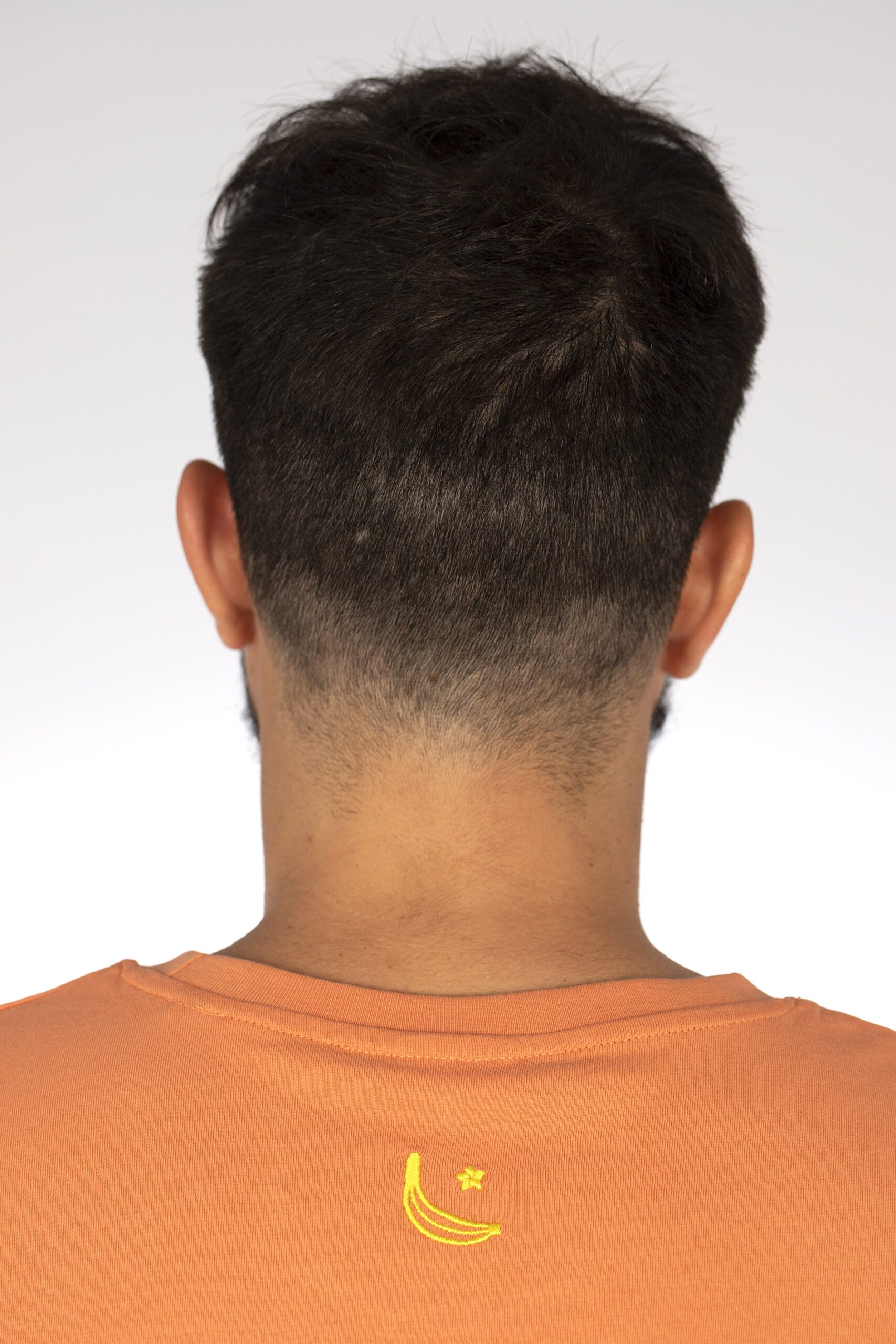 Posu ha elegido una camiseta naranja con un parche de algodón bordado con su cara en el pecho. En la parte trasera con el logotipo del plátano bordado en amarillo.