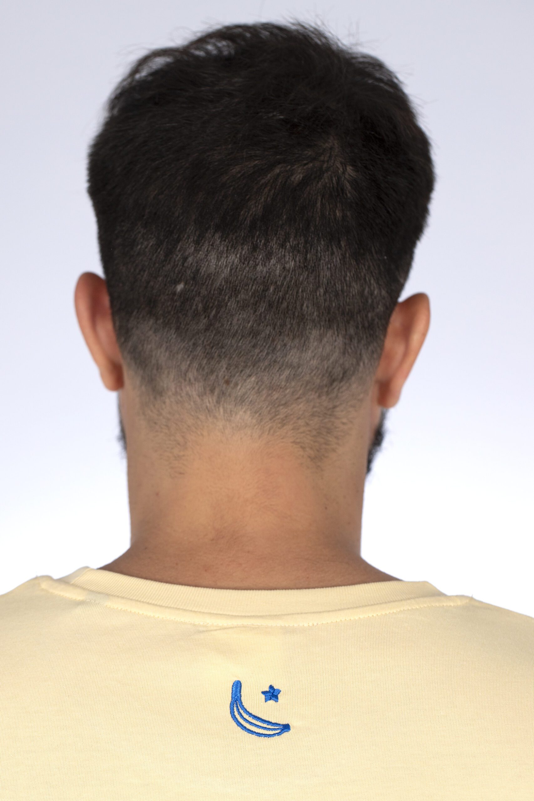 Con un parche bordado de algodón en color azul en el pecho, y un bordado azul con el logotipo del plátano en la parte trasera.